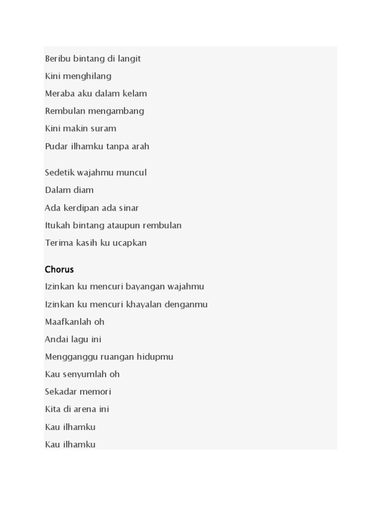 Beribu bintang di langit Kini menghilang Meraba aku dalam kelam Rembulan mengambang Kini makin suram Pudar ilhamku tanpa arah. About Press Copyright Contact us Creators Advertise Developers Terms Privacy Policy Safety How YouTube works Test new features Press Copyright Contact us Creators. Rambulan mengambang kini makin suram Lyrics for kau ilhamku by man bai.